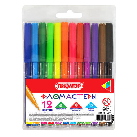 Яркие фломастеры от бренда «Пифагор» идеально подойдут юным художникам! В наборе целых 12 цветов – хватит всей компании друзей. А ещё они оснащены вентилируемыми колпачками, так что можно спокойно давать их малышу и не переживать за его безопасность. Отличный выбор для обучения и творчества!