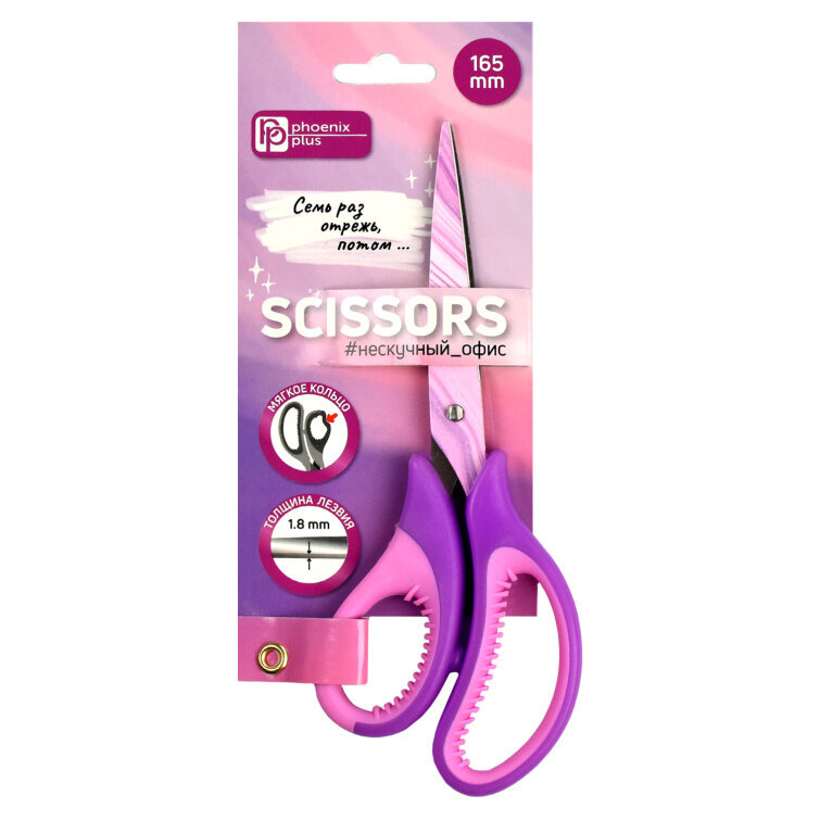 Ножницы офисные Феникс+, арт.64527/ 12 МРАМОР (розовый, сиреневый, 16,5 см, длина лезвия: 7 см, нержавеющая сталь, асимметричные, универсальные, картонная подложка с европодвесом)