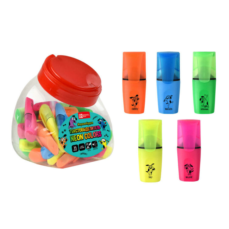 Текстовыделитель арт. 58697 / 35 ВЕСЕЛЫЕ ПЕСИКИ (БАНКА, 35 шт., ассорти, цвет: голубой, жёлтый, зелёный, оранжевый, розовый, 72х27х17 мм, материал корпуса: полипропилен, форма наконечника: скошенная,