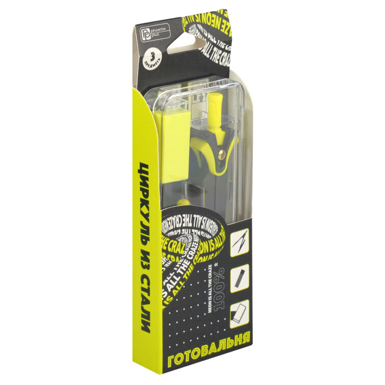 Циркуль в комплекте со сменными грифелями и ластиком , НЕОНОВЫЙ ЖЕЛТЫЙ арт.62701/ 24 НЕОНОВЫЙ ЖЕЛТЫЙ ( Макс. диаметр окружности: 23,4 см, 5,2х12,8х1,6 см, длина циркуля 11,7 см, шелкография в одну кра