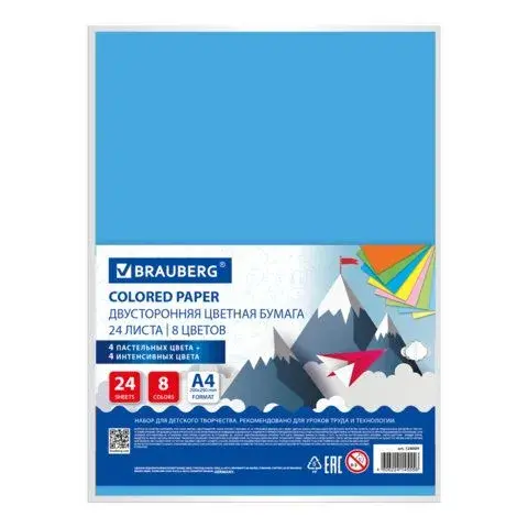 Цветная бумага 8 цв 24 л. (Brauberg) А4 ТОНИРОВАННАЯ В МАССЕ, 24 листа 8 цветов (4 пастель + 4 интенсив), BRAUBERG, 200х290 мм, 128009